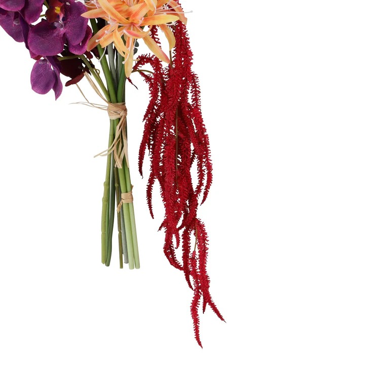 This striking bouquet features diamond lilies and drooping amaranth.